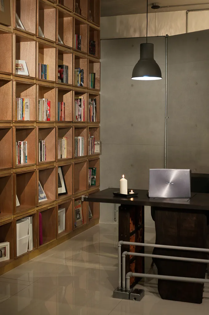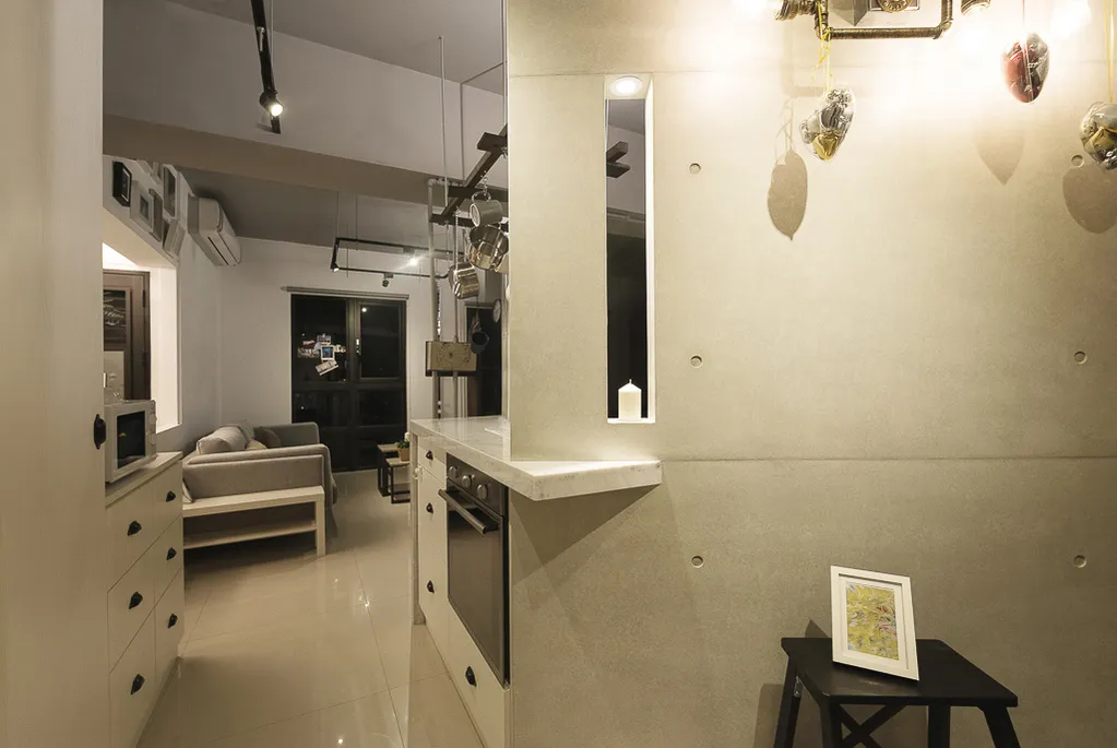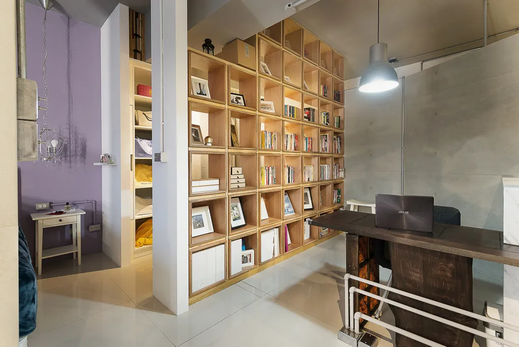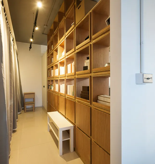 從玄關進來的過道兩側,順勢成為電器牆及廚具的懸掛空間。鏤空的原色木製櫃體裝潢,帶給冷靜的空間些許溫暖表情,作為工作區的書牆,也成為與最深處更衣室共用的收納立面,同時保留了空間的通透性與靈活性。