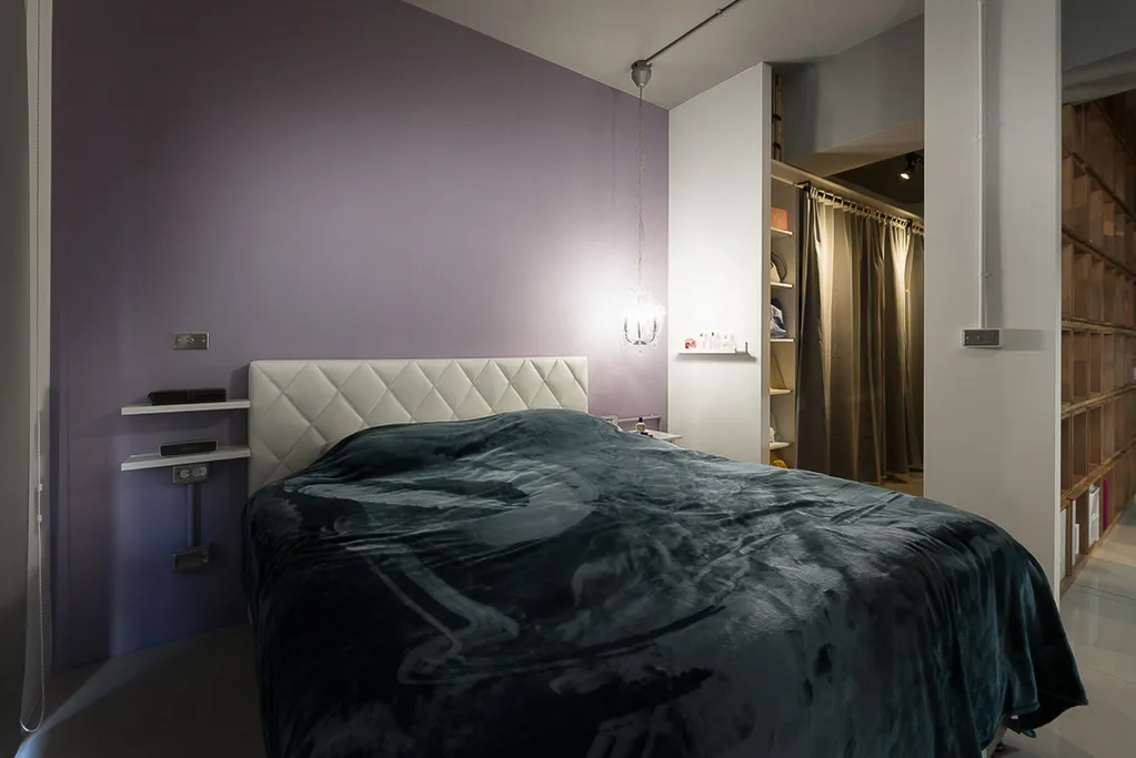 與之區隔的是半開放的電視牆內側,隱現著柔和的煙燻紫,水晶床頭燈成為空間中一抹浪漫的點綴。跳色壁面讓氛圍一轉進入私密放鬆的臥房空間,容納了屋主本人洗鍊俐落中仍然保有女性獨特的柔軟。